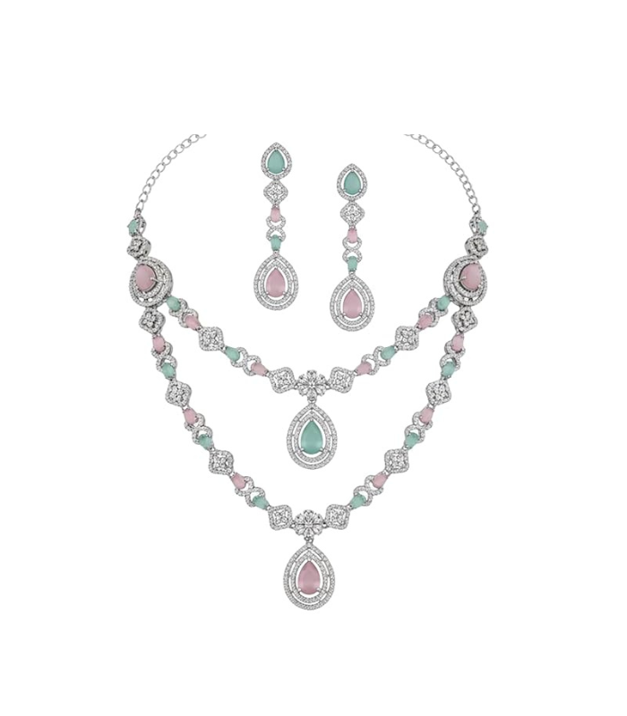 Atasi International presents a double-layer silver-plated diamond style necklace with matching earrings and maang tikka, crafted with precision and premium materials. This jewellery set blends traditional elegance with modern design, making it perfect for weddings, engagements, parties, and festive occasions. A timeless accessory that enhances every woman’s beauty and adds grace to special moments.