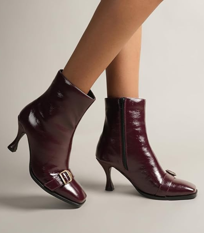 Step into refined style with the Hendrix Ankle Boots, crafted to stand out with their bold glossy finish and rich cherry red tone. Designed with an 8.5 cm (3.35-inch) kitten block heel, these boots offer a graceful lift while remaining comfortable for long wear. The sleek square-toe silhouette brings a modern, fashion-forward touch—perfect for dressing up jeans, office looks, or evening outfits. A smooth side zipper ensures effortless wear, while the durable Tunit rubber sole provides stability and confident movement throughout the day. Whether you’re heading to work, stepping out for dinner, or elevating a casual winter fit, Hendrix boots bring just the right balance of comfort, attitude, and signature style.